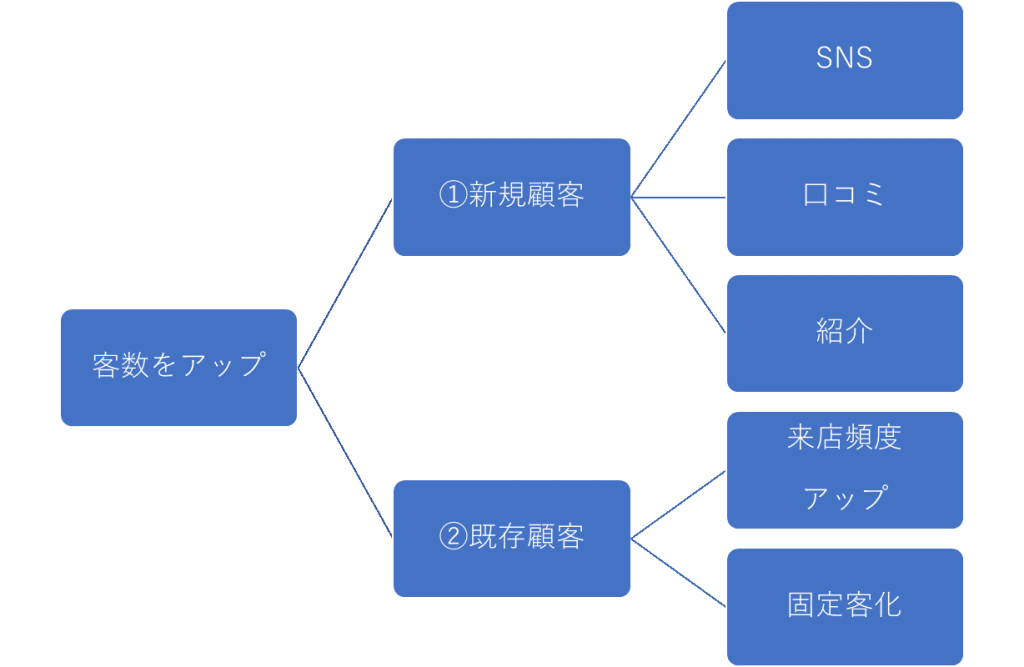 客数アップは、まず①新規顧客、②既存顧客に分けて考えてみます。